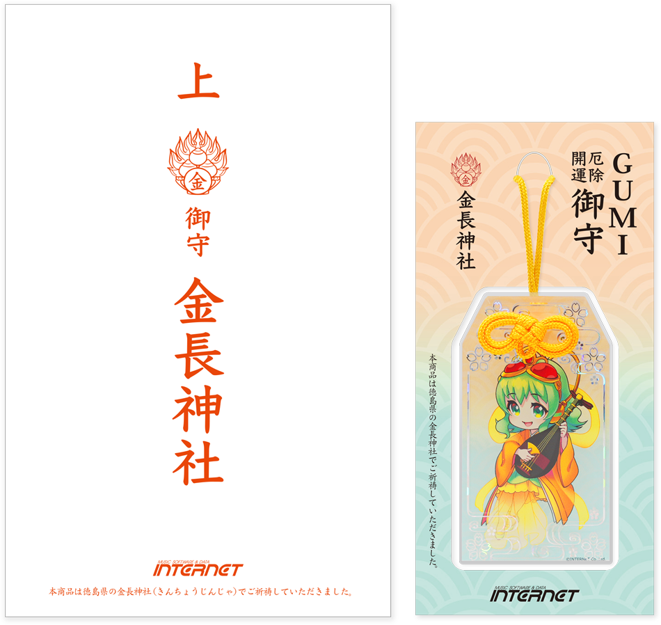 御守用に書き下ろしたイラストを使用し、キラキラ光る箔押し加工をしてめがね結びをした紐をつけています。