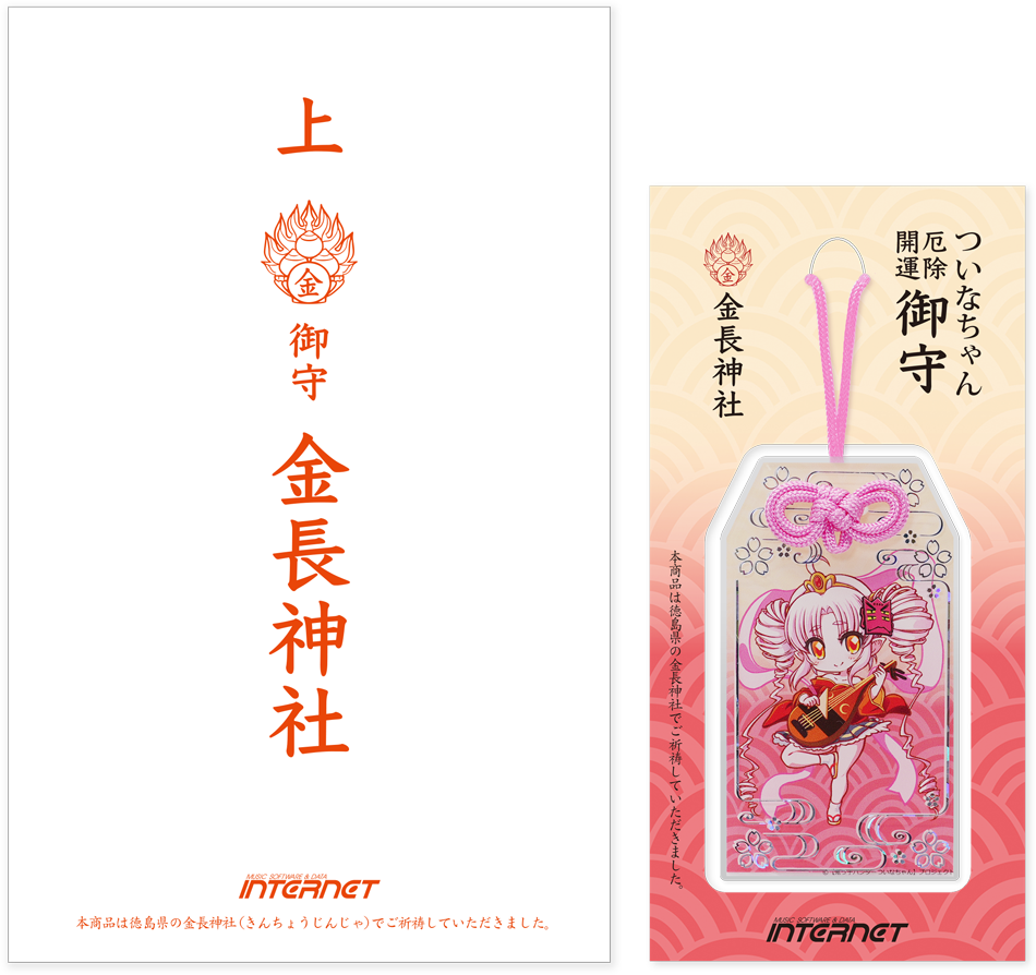 御守用に書き下ろしたイラストを使用し、キラキラ光る箔押し加工をしてめがね結びをした紐をつけています。
